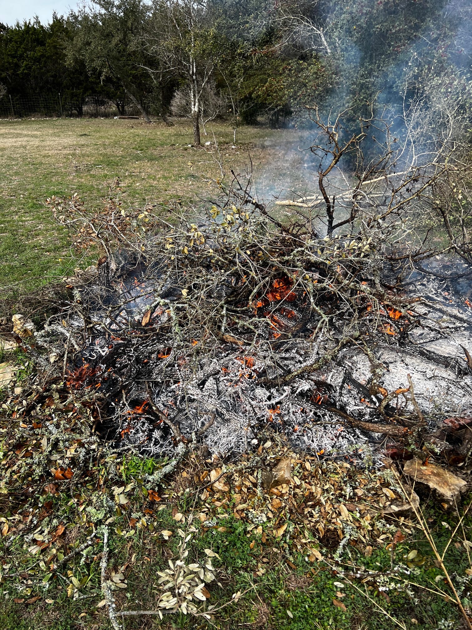 Yesterday was brush-burning day. It’s a regular occurrence in the Texas Hill Country when you have a little acreage and a significant live oak population. We just had a little ice storm a couple weeks ago, and although no structures were damaged it was heartbreaking to see the devastation of the trees. I had hundreds of limbs down and several entire trees. The work began immediately, sawing and dragging into huge piles for the eventual cutting process of cutting some larger limbs for firewood and burning the rest in a huge open fire pit on the back of the property.